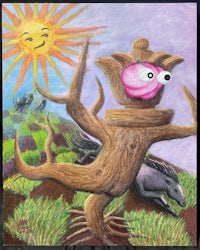 Watercolor, colored pencil, and carving on cold press grounds on found wood panel